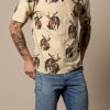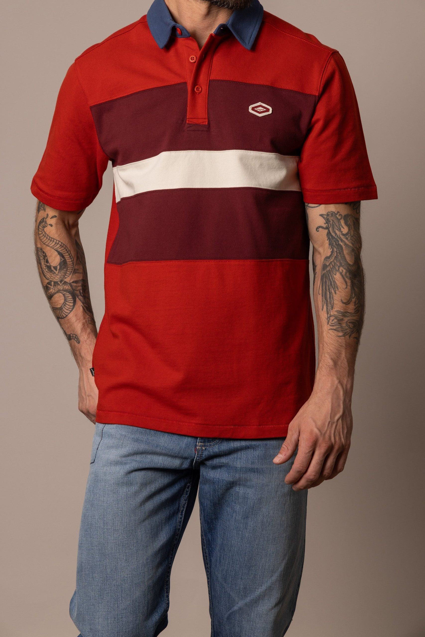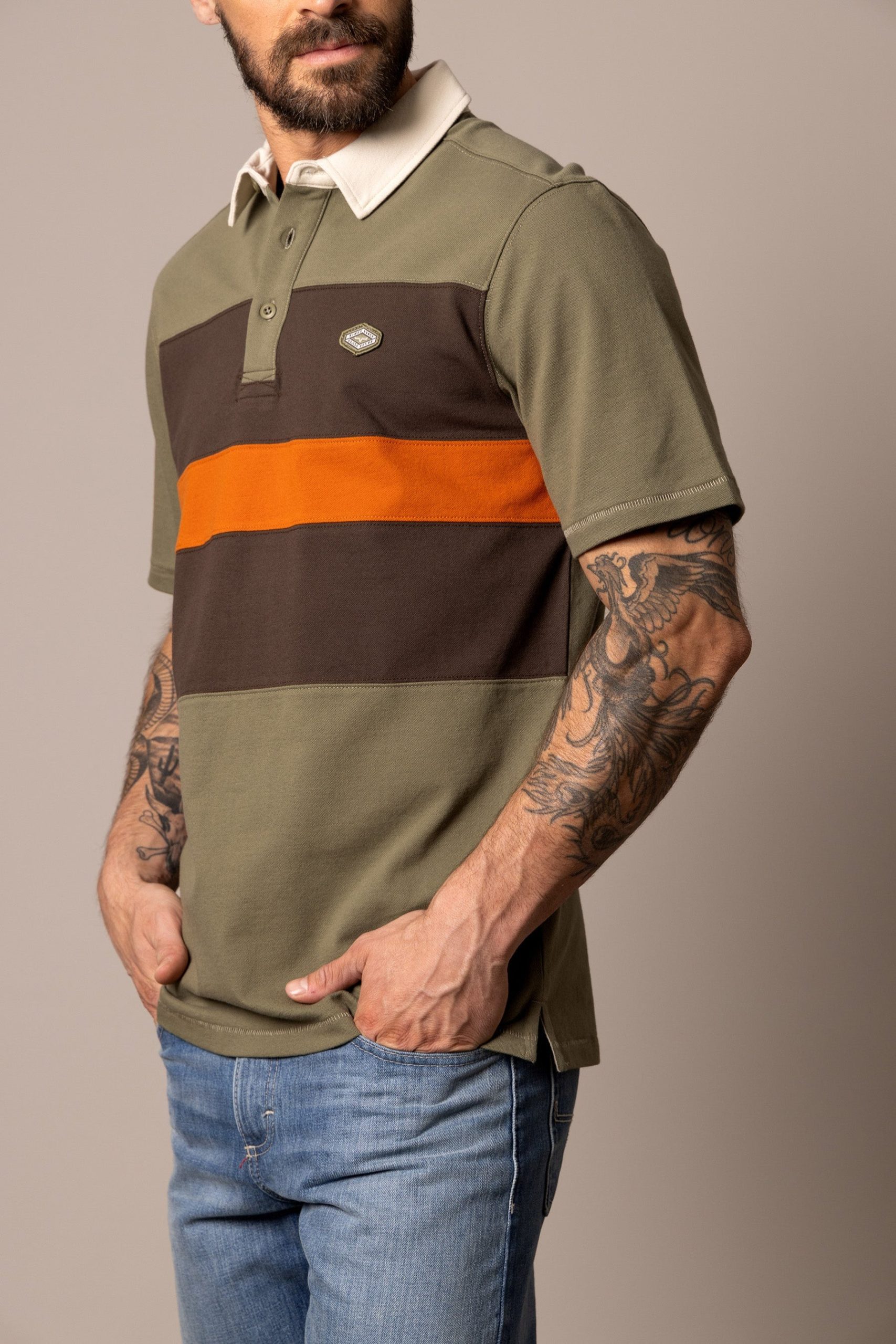 This bold piece is a modern take on classic 70s rugby style. infused with our signature western flair. The diamond Kimes Ranch logo placed on the left chest adds an authentic touch. Crafted for comfort and mobility. the button neckline and side seam slits allow for both. Featuring bold horizontal chest stripes in a rustic color palette. this polo is a statement piece that demands attention.