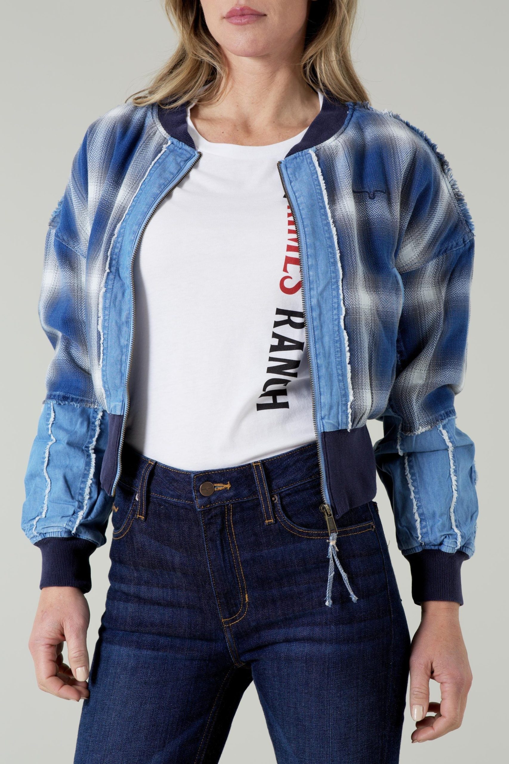 The Belinda Bomber combines a vintage vibe with a modern flair. An all-over indigo dyed plaid and denim mix is destroy washed with frayed seams to create that favorite feel the moment you put it on. The short stand up collar and ribbed waist add structure to a casual. loose fit.