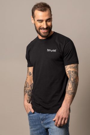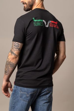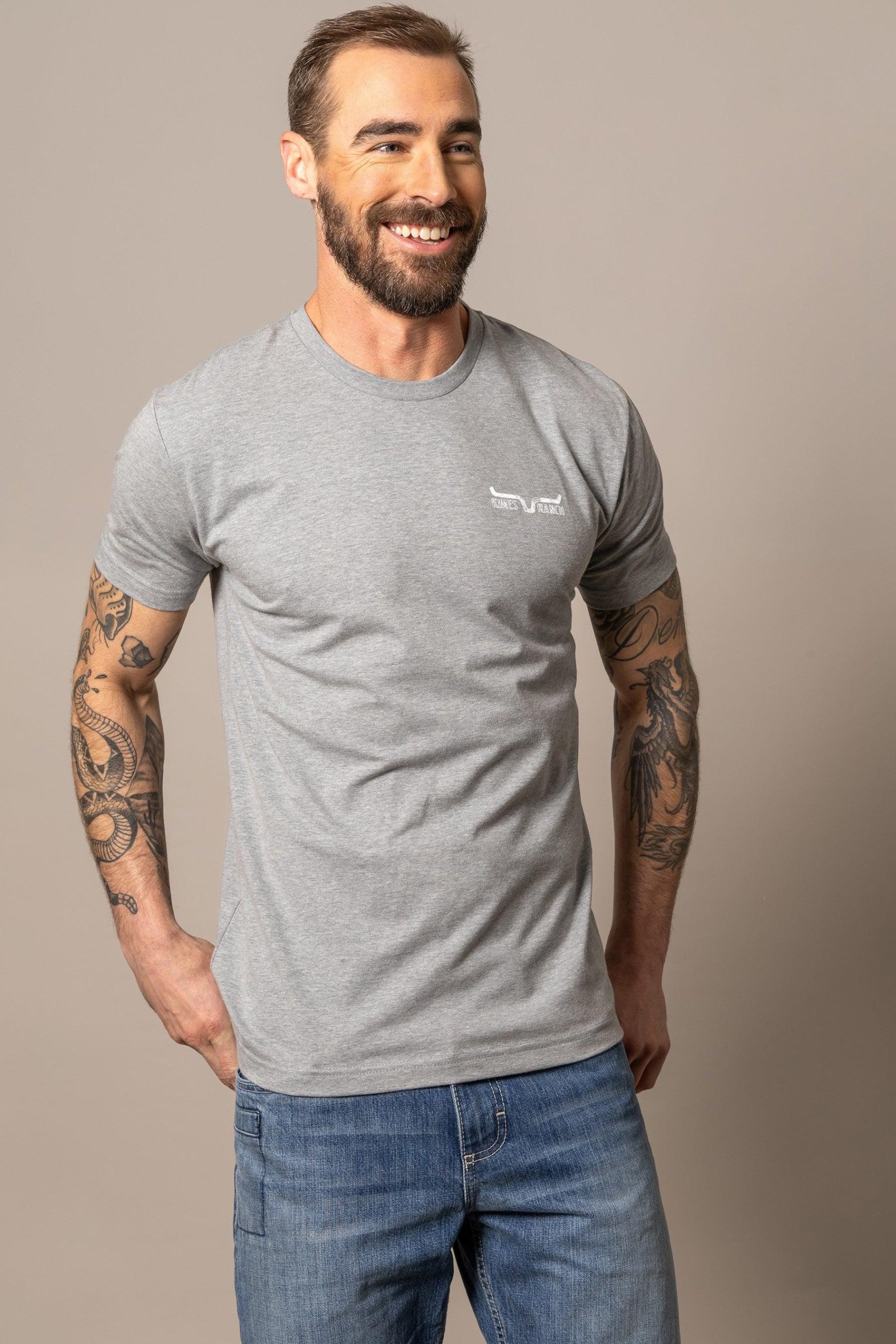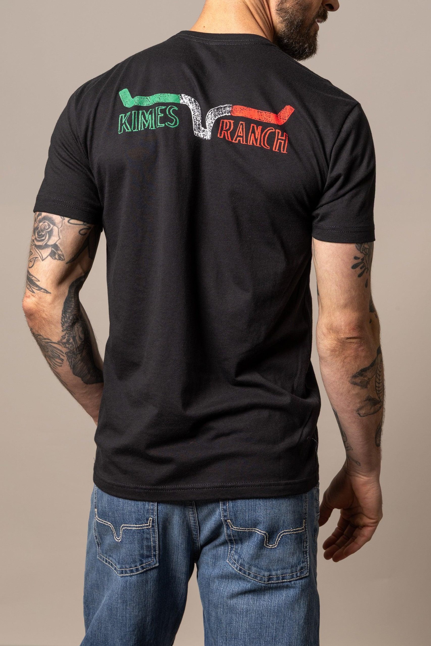 A large Kimes Ranch logo brands the back of this t-shirt. with a smaller logo on the front left chest.