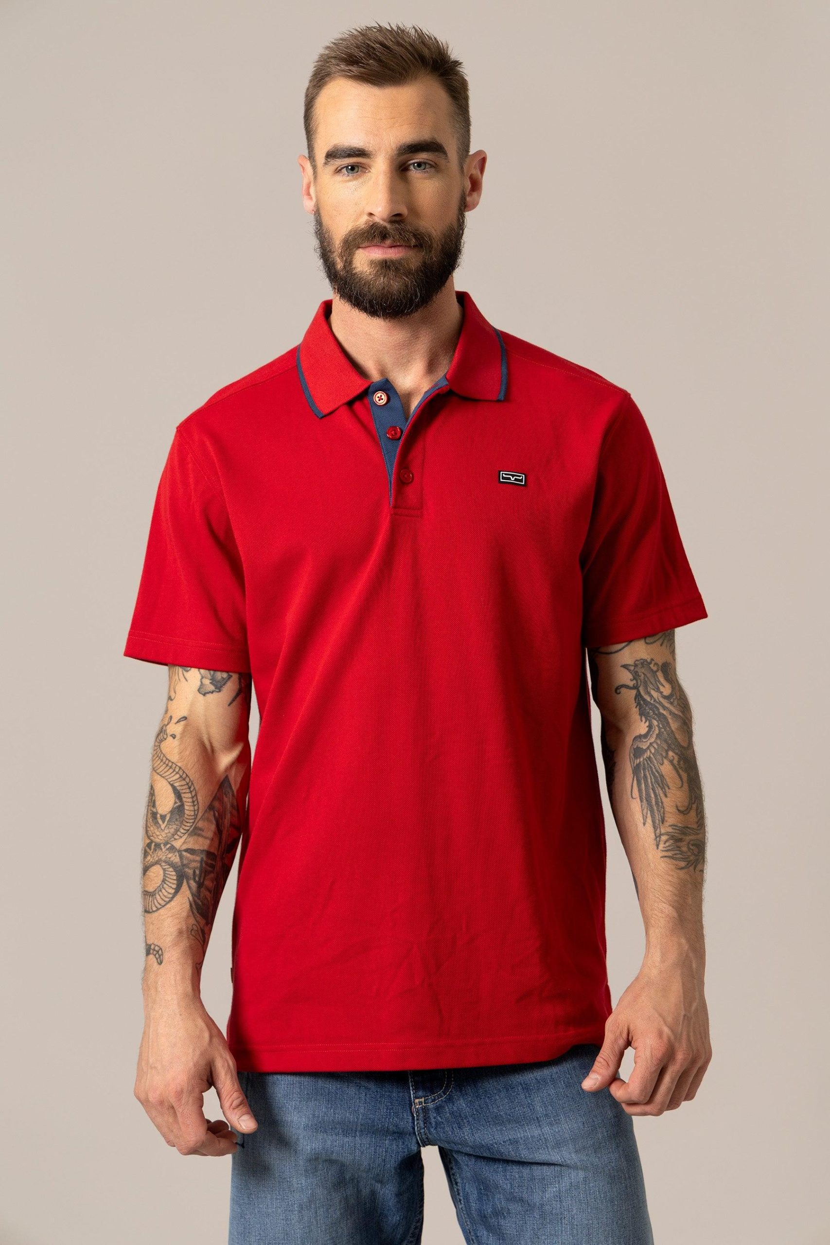 Details: Contrasting neckline. Kimes patch on left chest