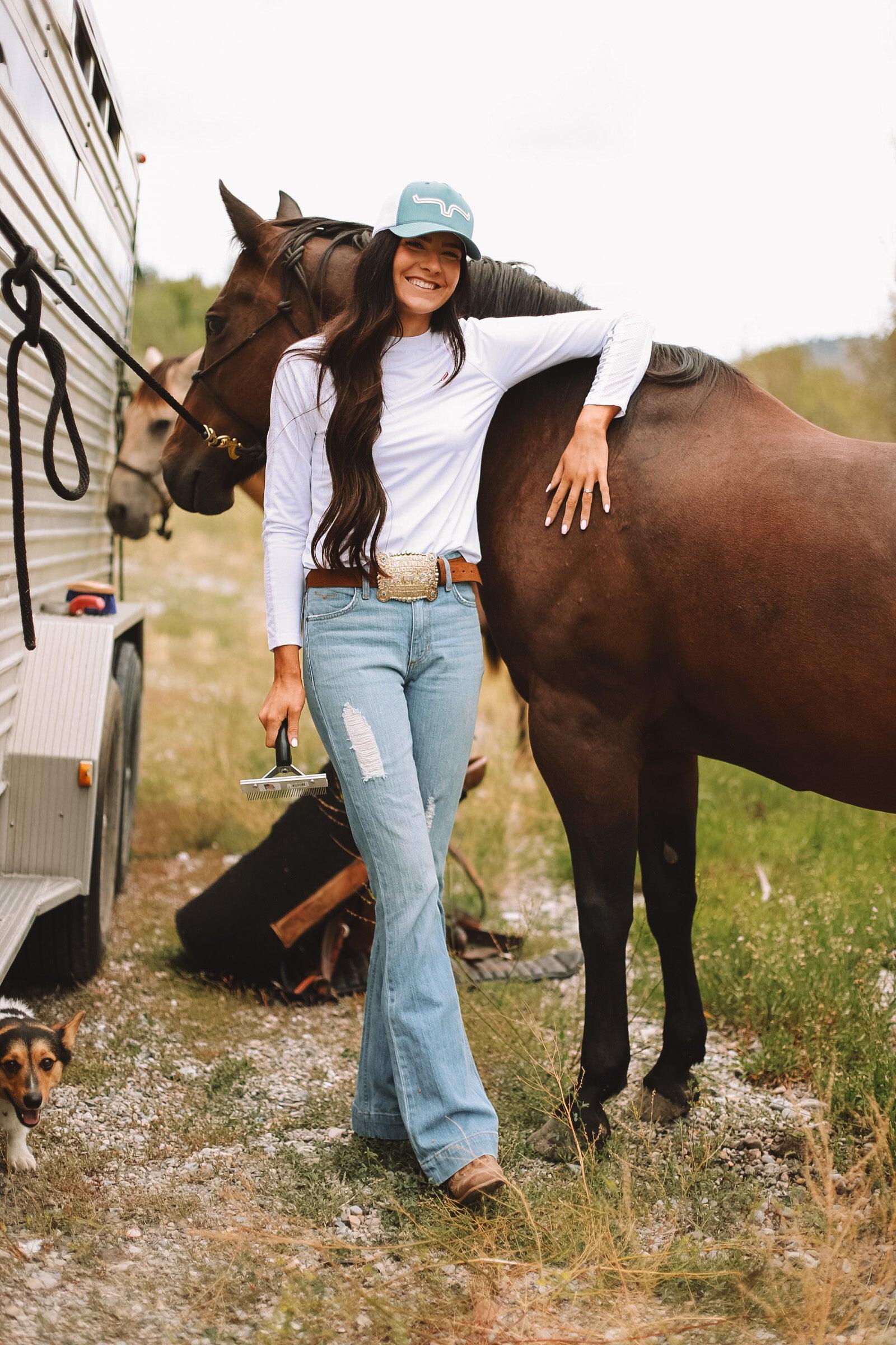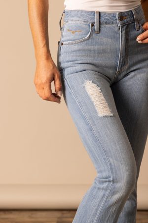 Our popular Jennifer jeans are in lighter. distressed denim. The ultra-high rise and super wide flare leg flatter all shapes and sizes. while the lighter denim updates the look without sacrificing the durability of our ring-spun denim.