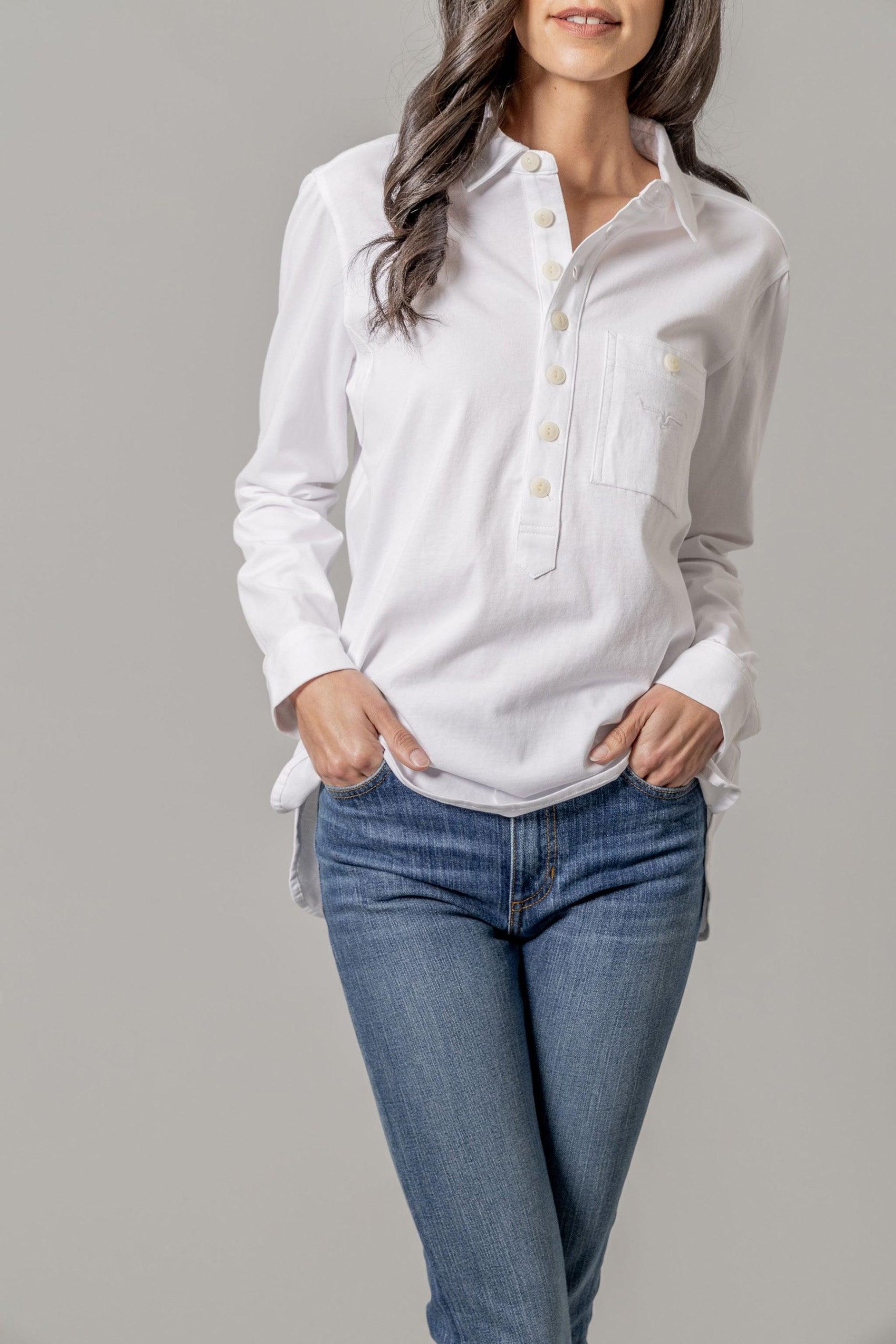 Meet the denim shirt that redefines casual and cool. This shirt has a western yoke with double chest pockets. and a 3/4 button placket to customize the neckline. The subtle high-low hem adds a touch of trendy asymmetry. Crafted from soft yet structured jersey denim. the Judith provides the perfect balance between relaxed comfort and modern western style.