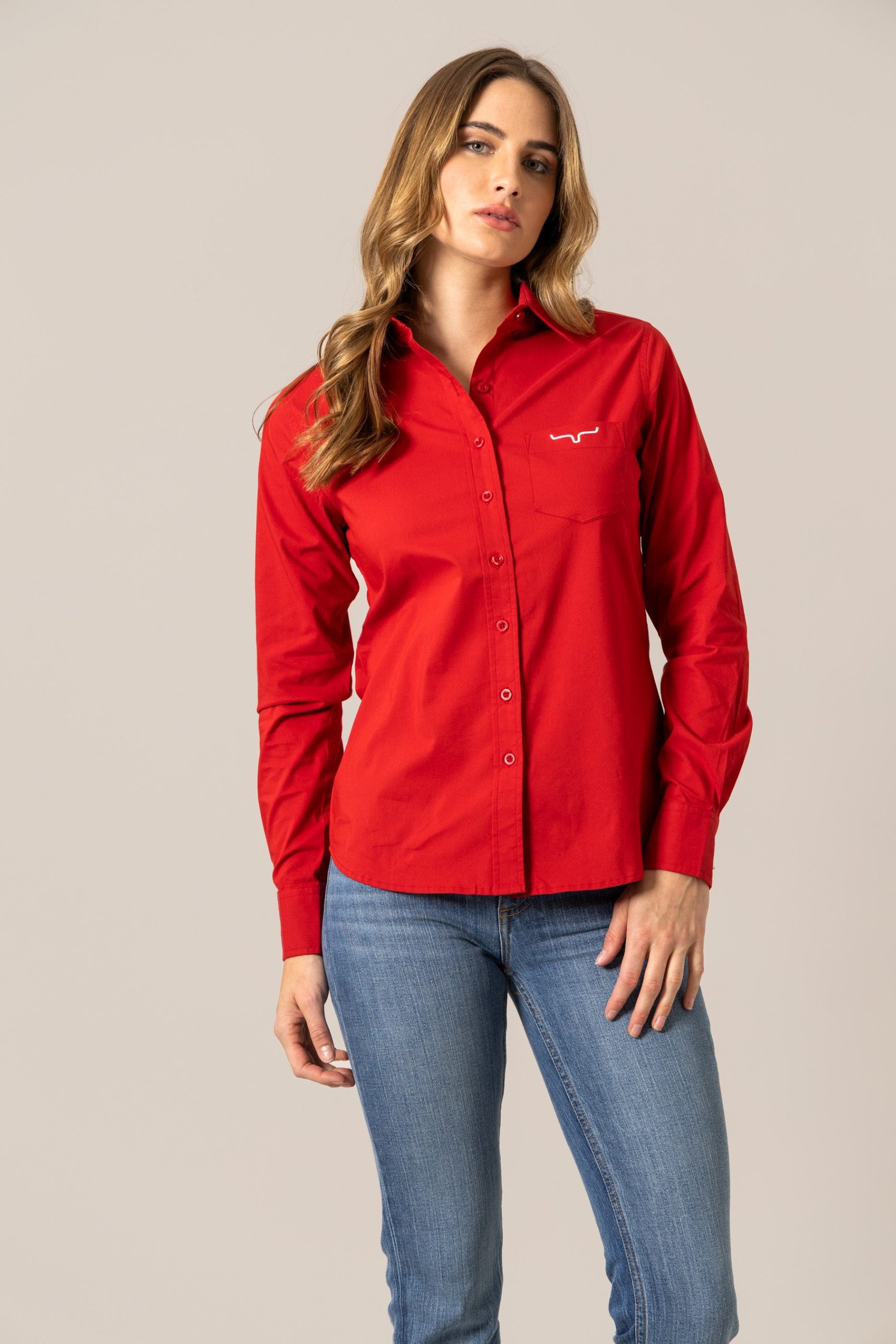 Details: Long Sleeve Solid Shirt. Classic Button Front and Sleeves. Single. Pointed Pocket with Embroidered Logo on Top Hem