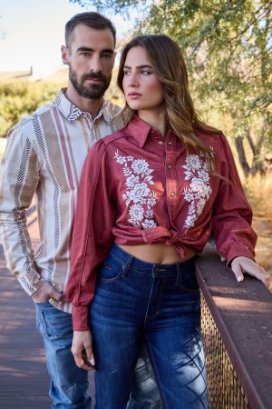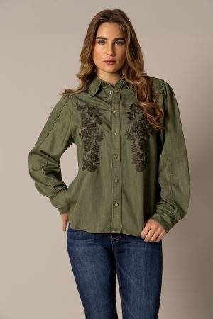 This airy. relaxed-fit top features delicate floral embroidery that cascades down the front and across the back yoke. creating a sweet and elegant look. The long sleeves are tapered. adding a touch of sophistication. while the soft. breezy fabric ensures all-day comfort. Perfect for dressing up or down. this blouse is a versatile piece that exudes charm and femininity.