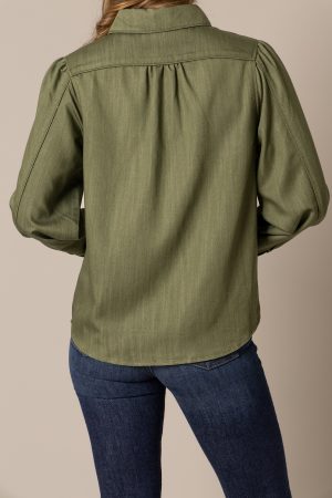 Details: Snap front buttons. embroidered front panels. full gathered sleeves