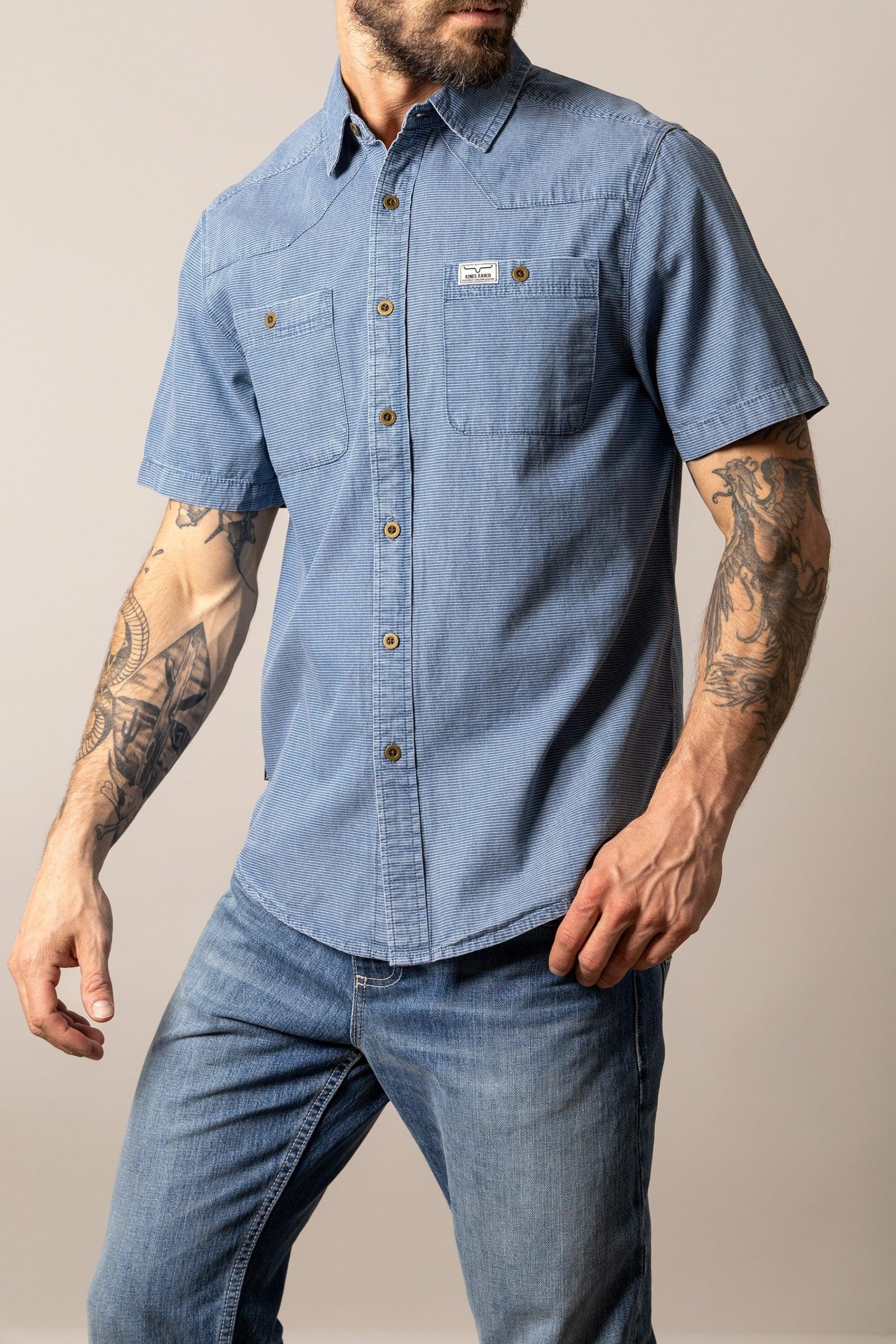 Details: Short sleeve. double chest pockets. button front. Kimes Ranch patch on left chest pocket