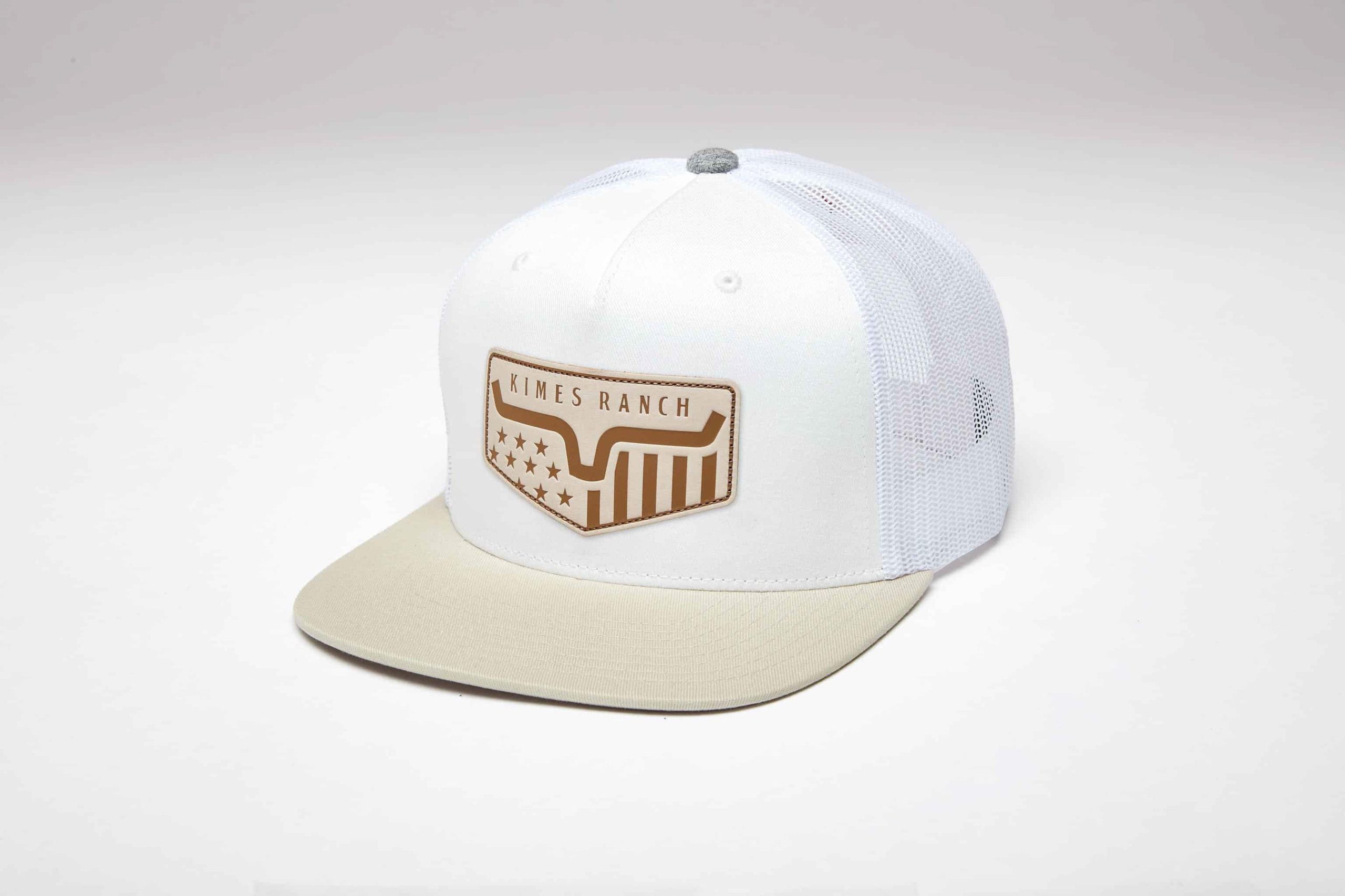 The Spangled Hat embodies Western pride and modern craftsmanship. This 6-panel ranch hat features a high-profile. structured fit with a flat bill and premium details throughout. A genuine leather patch embossed with the Kimes Ranch logo and an American flag motif highlights its rugged character. while the faux suede bill adds texture and a refined finish.