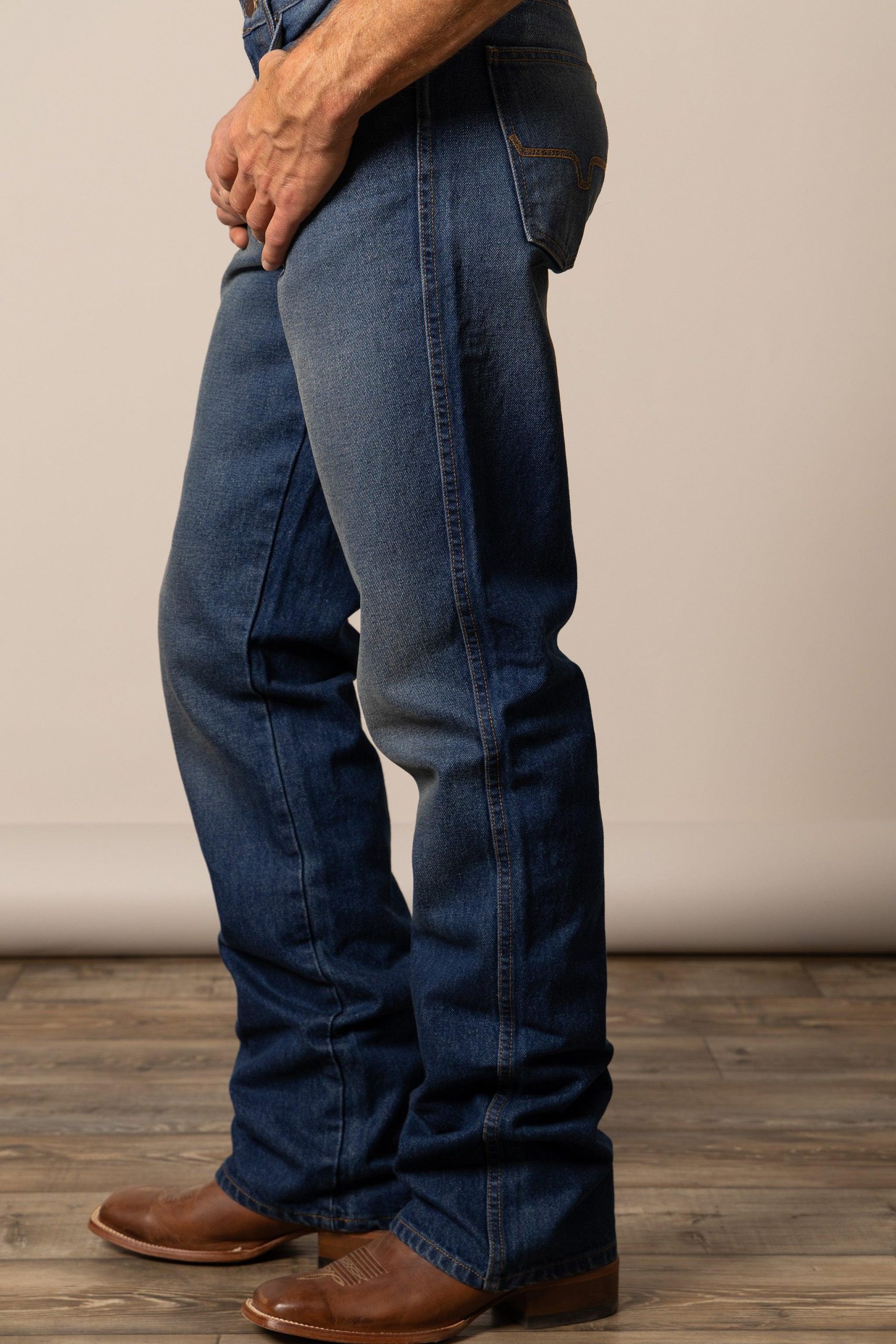 Made for comfort and crafted with durability. the Stewart is our most relaxed men’s bootcut jean style. Featuring a loose thigh and wider knee that flows into a classic bootcut leg. the Stewart is made from 100% cotton denim and designed for life on the ranch. in the arena. or out on the town. A mid-rise fit. hand-sanded medium blue wash. and our signature longhorn stitched back pockets bring timeless western appeal. The integrated knife pocket adds functional flair. making this the perfect pair for anyone who loves classic denim.