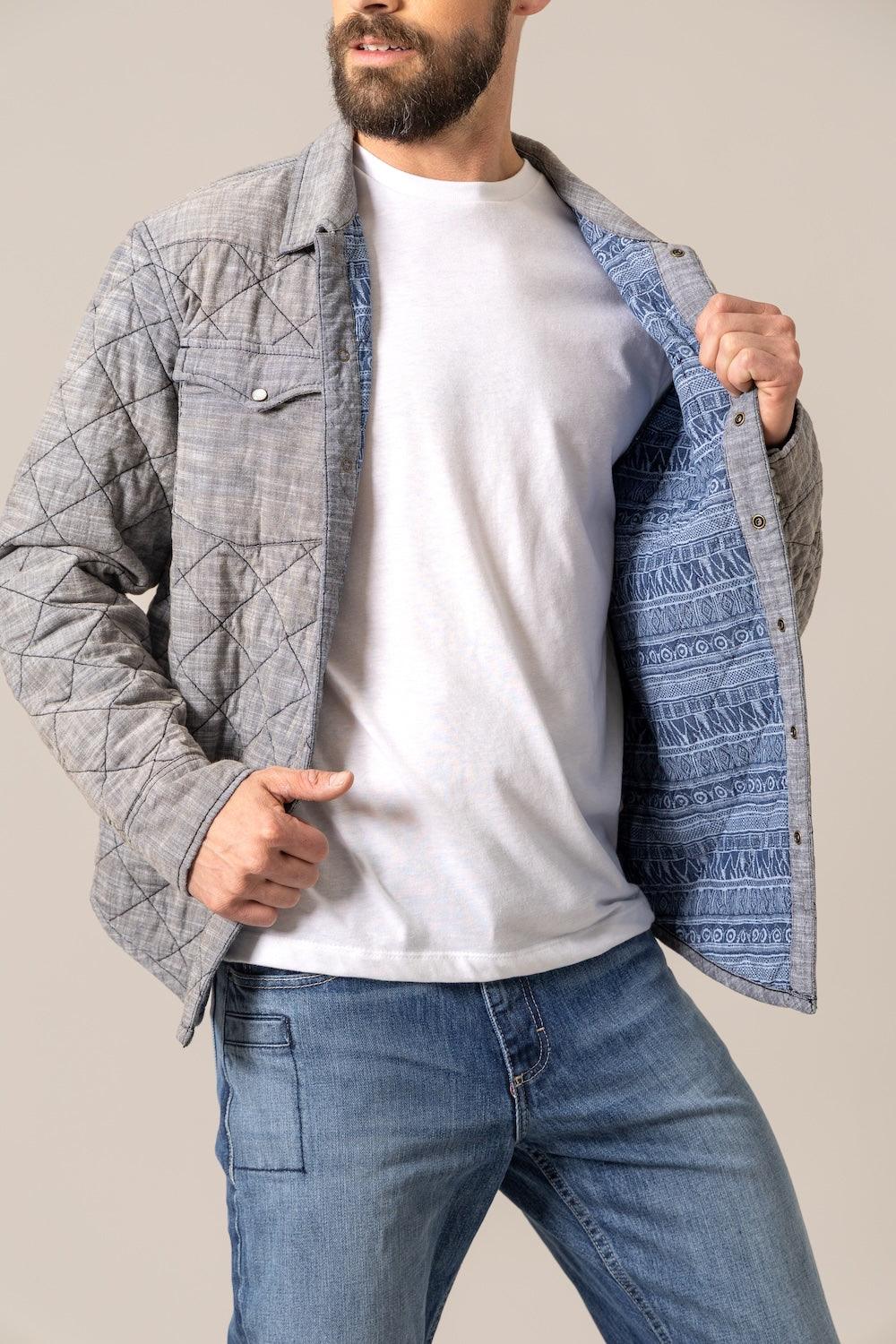 This jacket embraces the timeless style of a chambray shirt with the warmth and comfort of a quilted jacket. creating a versatile piece ready for any occasion. Pearl snaps that adorn the front closure and two chest pockets and the distinctive yoke all pay homage to the western style.