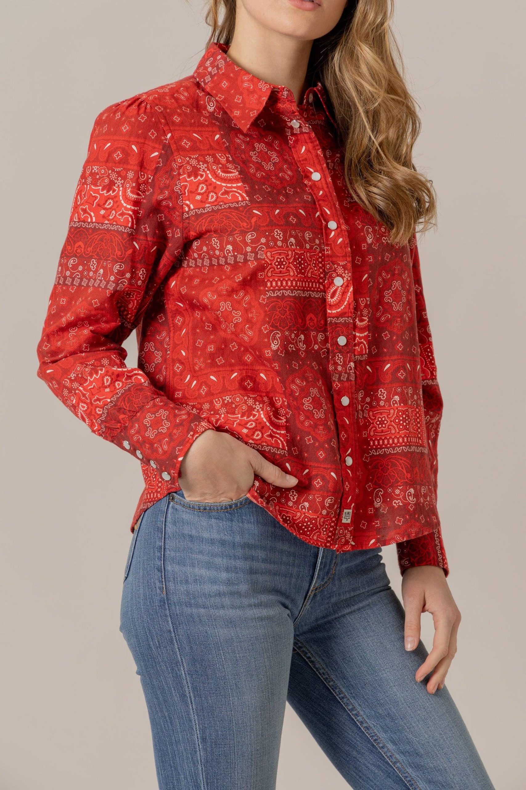 The Winnie is the next sought-after statement piece. This long-sleeved stunner features a bold bandana pattern. bursting with color and contrast. The sleeves gather at the shoulder and relax down to the button cuff. giving a fashion-forward silhouette to a classic button up.